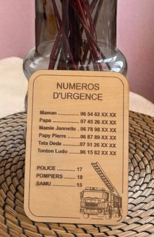 Plaque numéros d'urgence en bois gravé personnalisée famille