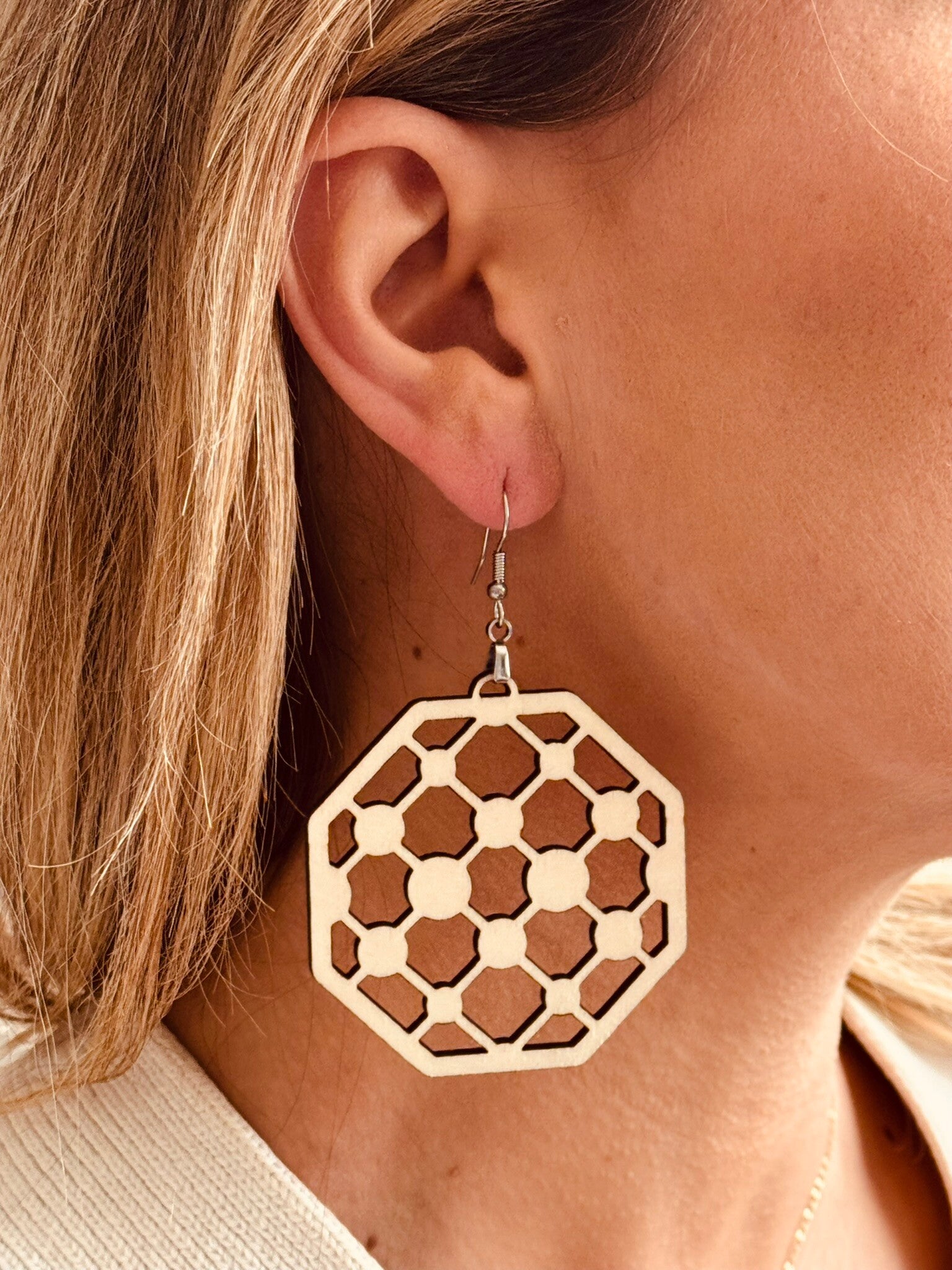 Inspirées des alvéoles d’une ruche, ces boucles d’oreilles en bois gravé apportent une touche naturelle et géométrique à votre style.