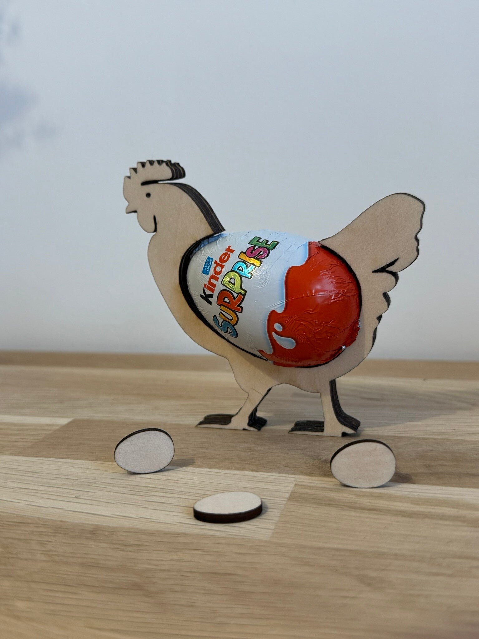 Craquez pour notre support œuf de Pâques en forme de poule 🐔 ! Conçu en bois gravé et personnalisable, ce présentoir est idéal pour accueillir un œuf en chocolat, comme un Kinder Surprise, et ajouter une touche festive à votre décoration de Pâques 🎉.
