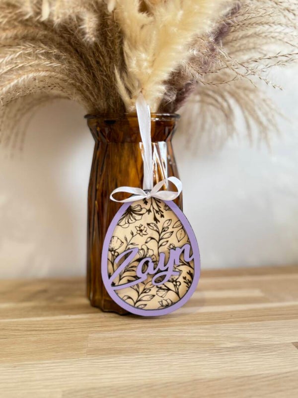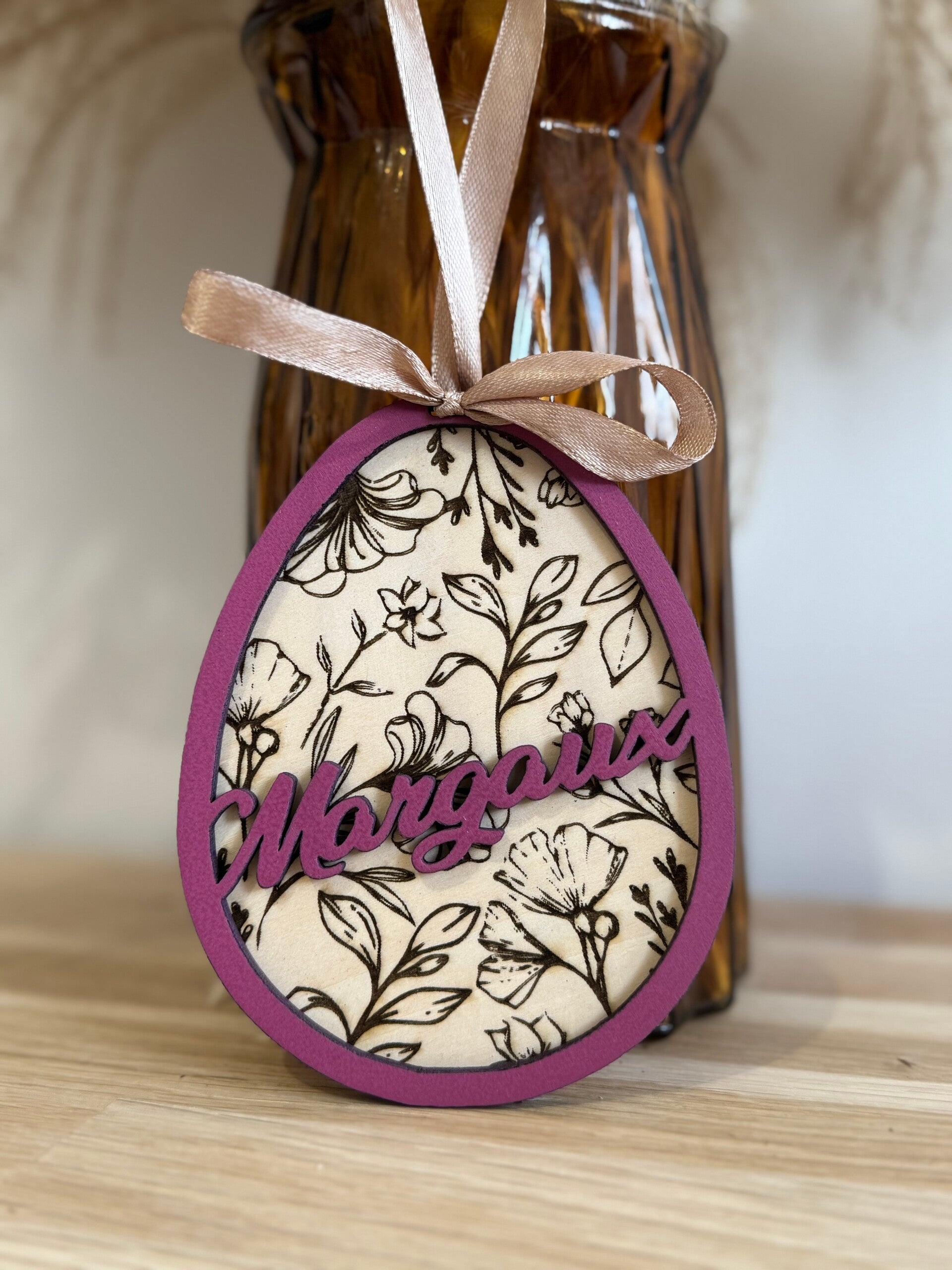 Œuf fleuri de Pâques prénom personnalisé avec ruban