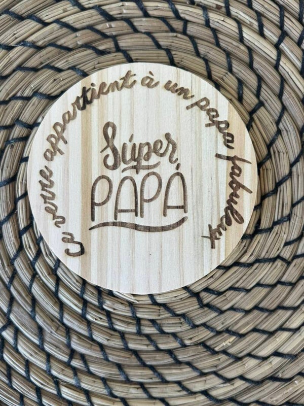 Ces dessous de verre en bois, d’un diamètre de 10 cm, sont gravés avec soin et illustrés de messages pensés spécialement pour les papas : drôles, élégants ou tout simplement touchants.