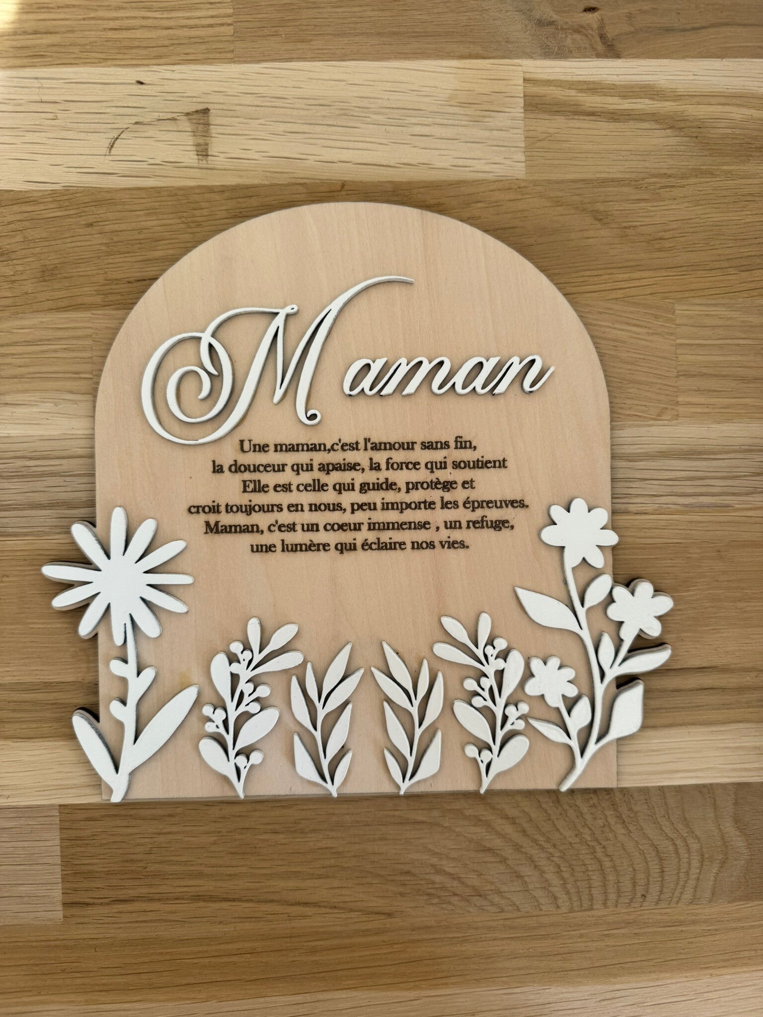 Cette plaque en bois gravée met en lumière l’amour inconditionnel d’une mère à travers un texte rempli d’émotion