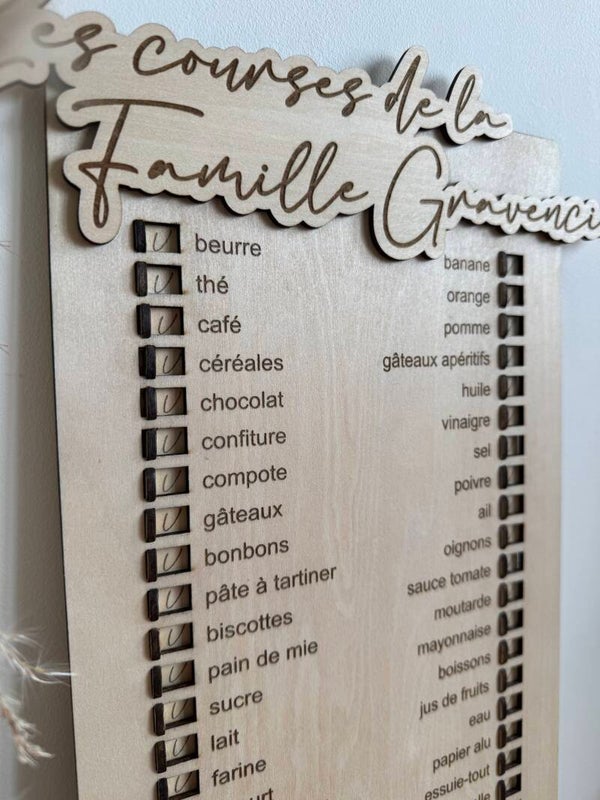 Tableau de courses familial en bois gravé – personnalisable et aimanté