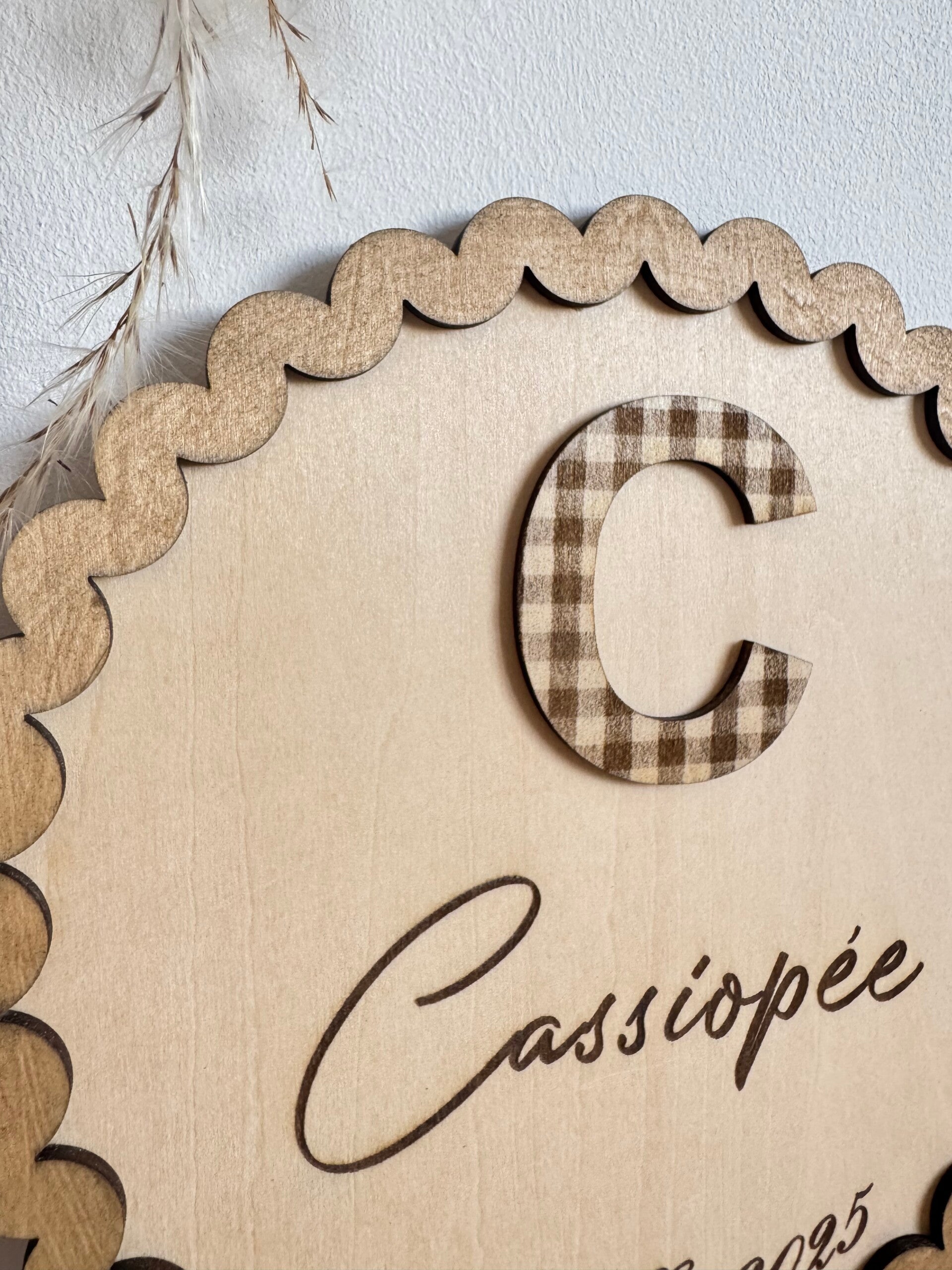 🌸 Écriture manuscrite et contour doux : Le prénom et la date sont gravés dans une typographie manuscrite élégante et légèrement bohème. Le contour ondulé en bois renforce l’aspect délicat et chaleureux de cette création.