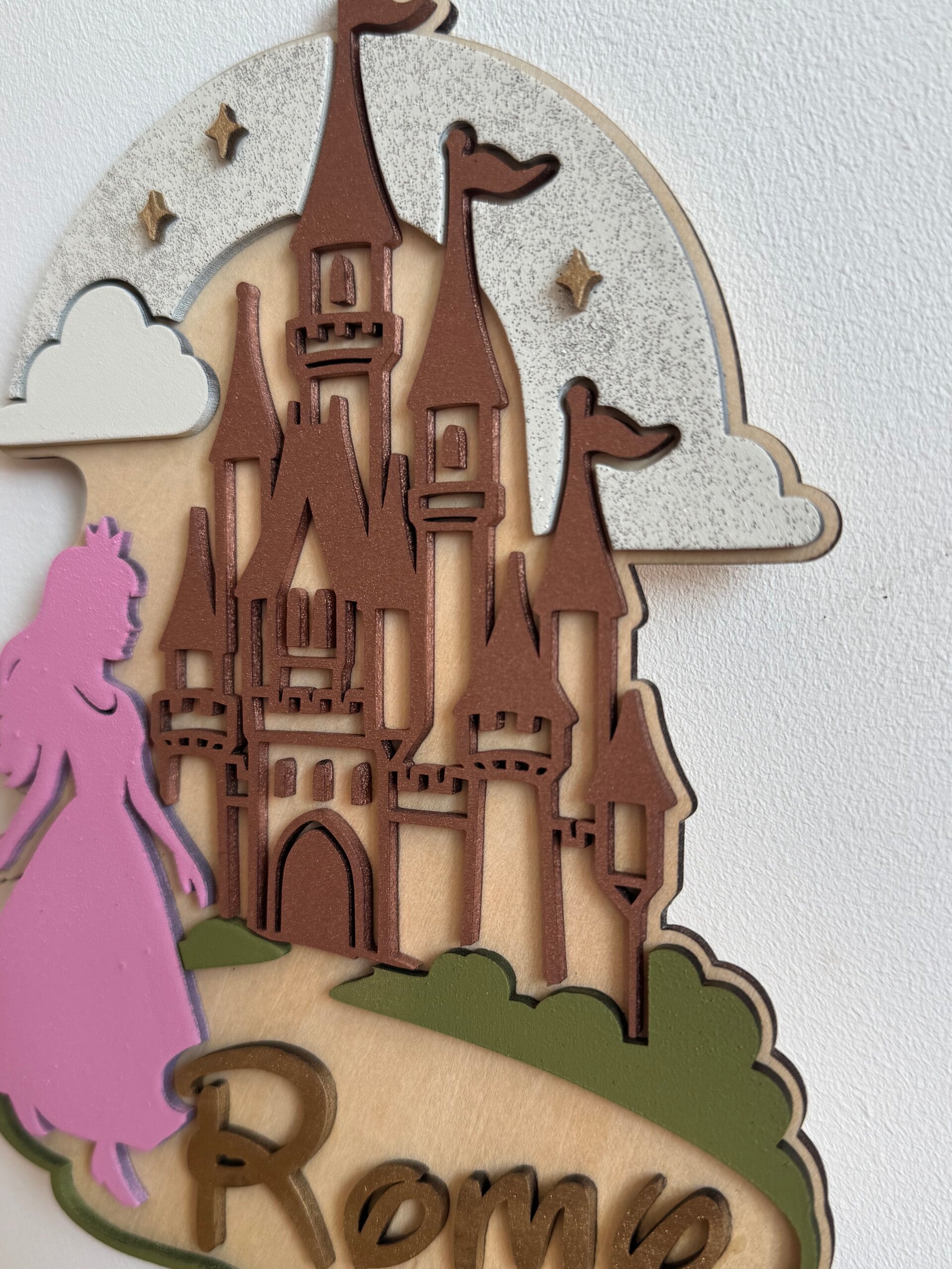 Fabriqué en bois gravé et découpé avec précision, ce décor unique représente un majestueux château de princesse, accompagné d’une silhouette élégante en robe, et du prénom de l’enfant en relief.