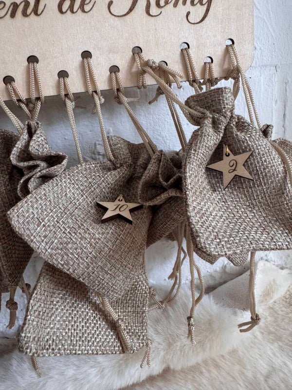 ✨ Composition : bois gravé, ruban en mousseline blanche, 24 pochons en tissu avec étoiles gravées