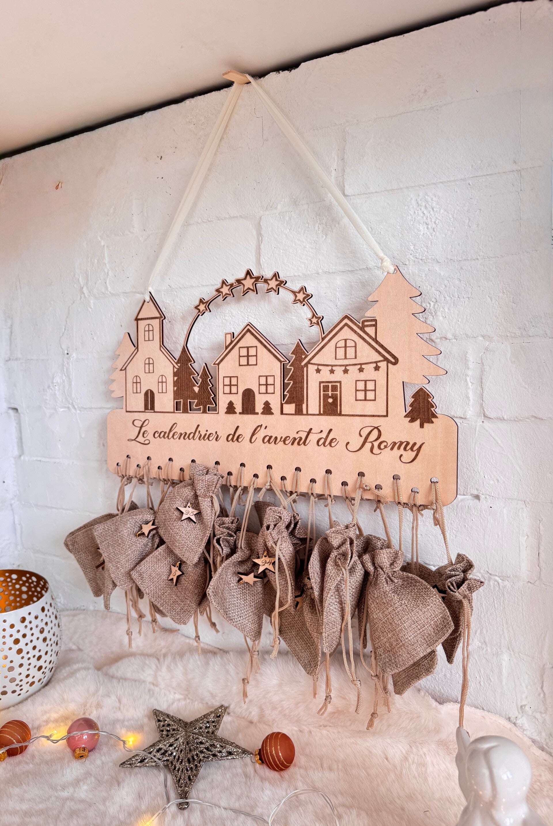 Il est livré avec 24 pochons en tissu numérotés grâce à de petites étoiles en bois gravées et suspendues à un anneau doré. Vous pourrez les remplir vous-même de petits cadeaux, friandises, mots doux ou souvenirs pour patienter jusqu’à Noël.
