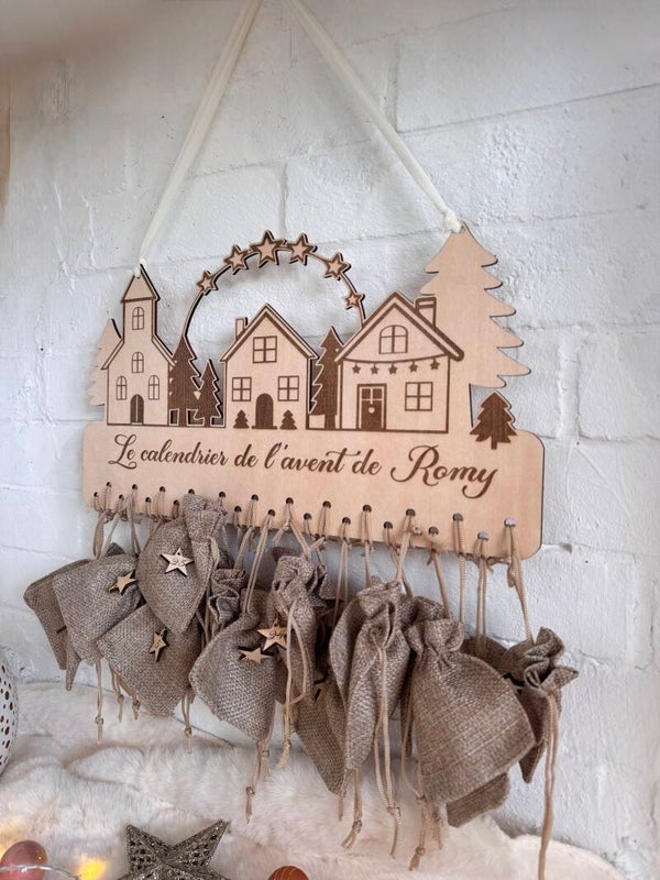 Calendrier de l’Avent personnalisé Village de Noël en bois gravé