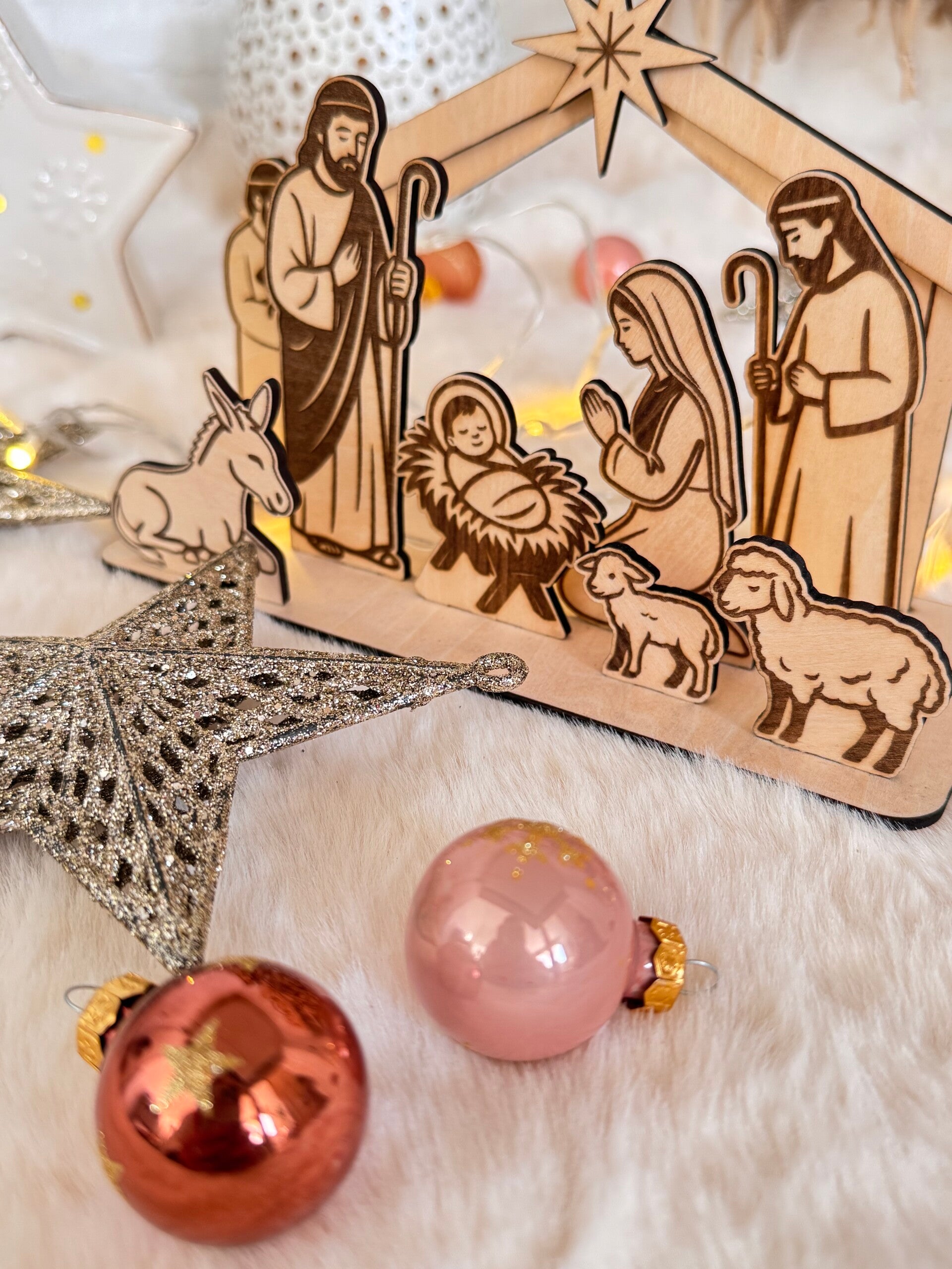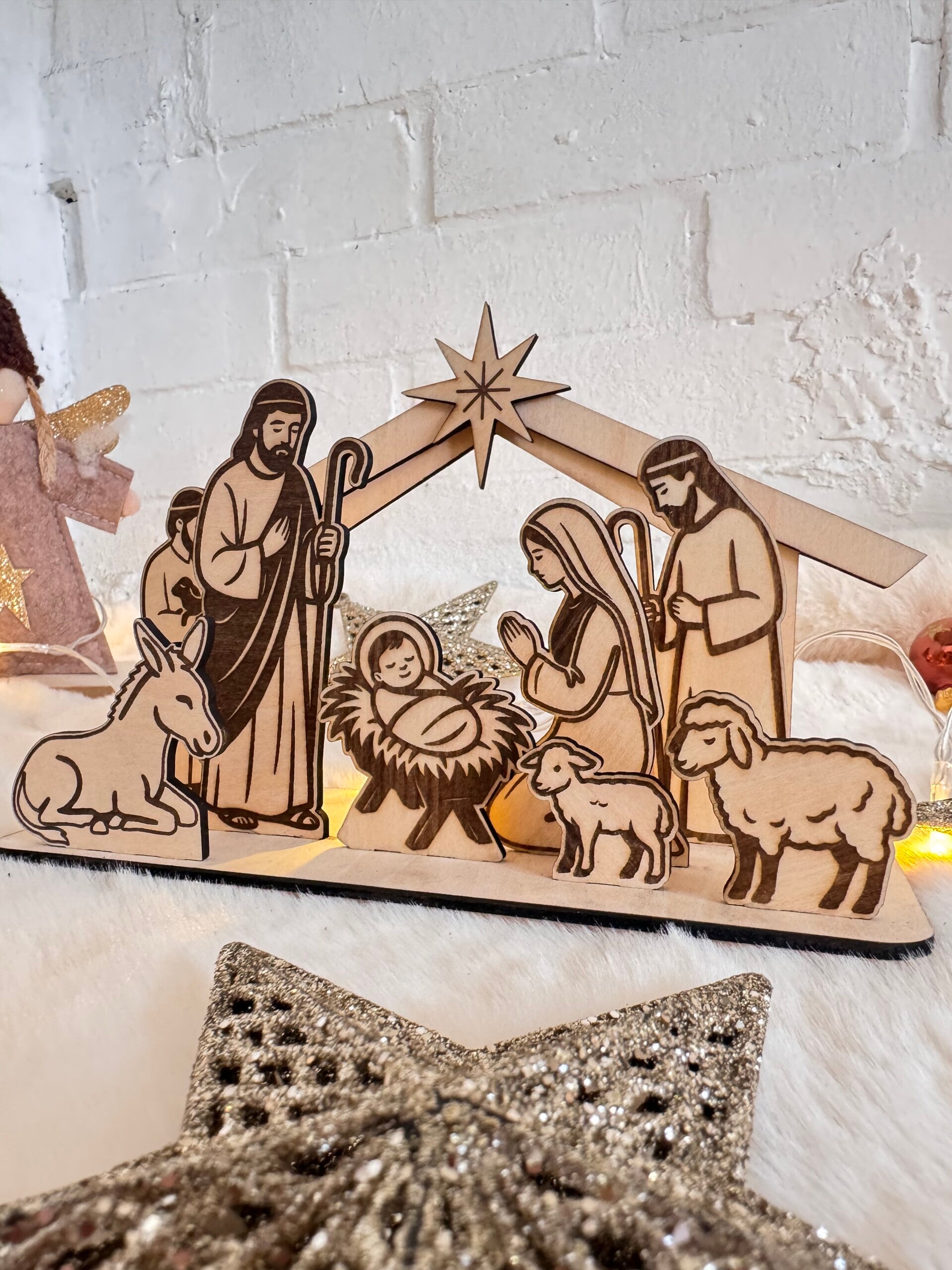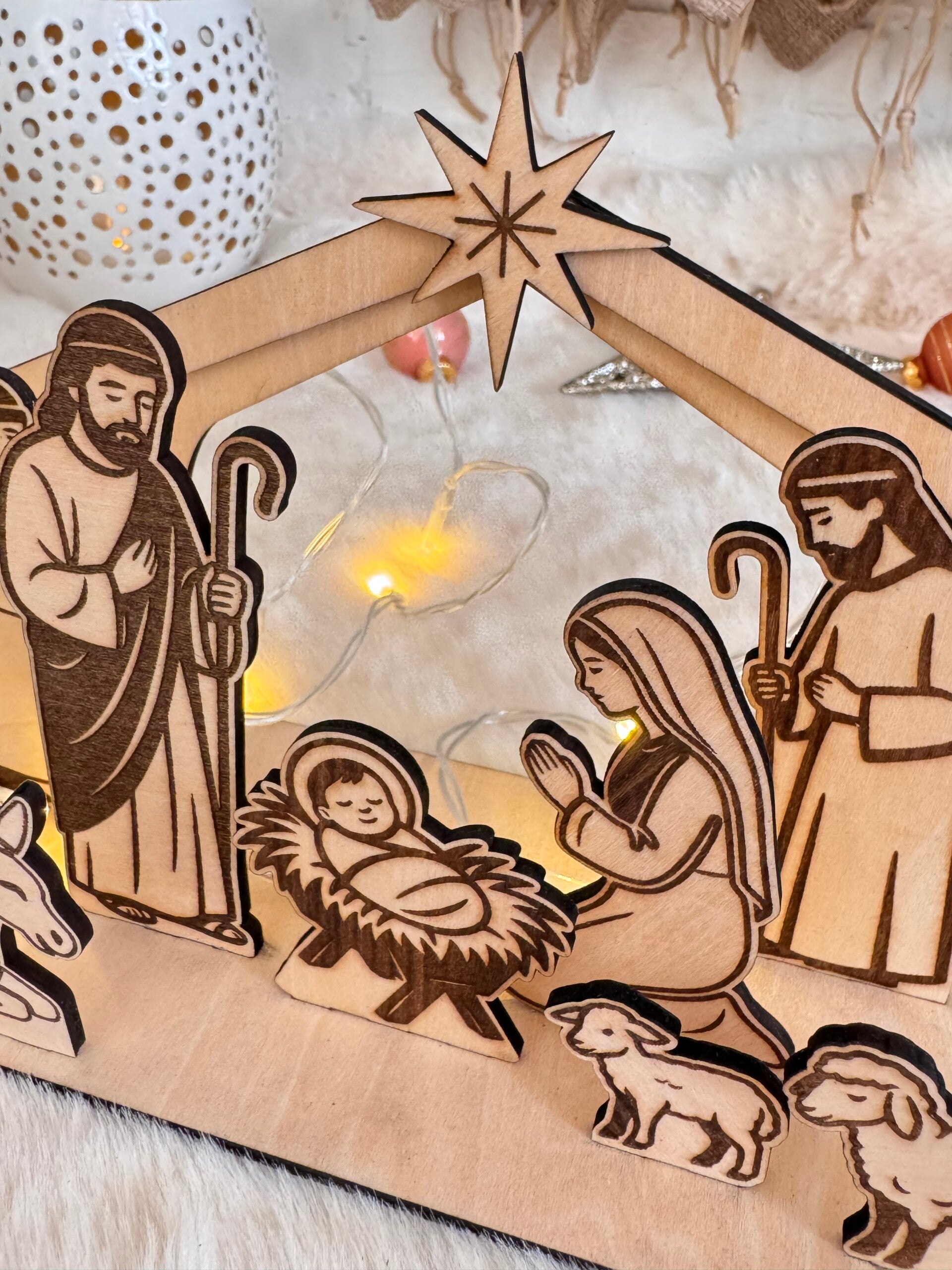 Chaque élément est découpé et gravé avec précision dans notre atelier, pour mettre en valeur toute la douceur de la Nativité : Marie, Joseph, l’enfant Jésus, les bergers et les animaux.