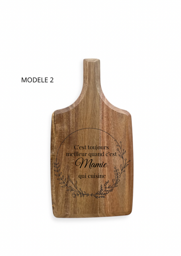 Chaque planche est personnalisée selon vos envies : choisissez parmi 6 modèles de gravure, puis indiquez le texte à graver dans la zone de personnalisation (prénom, citation, famille, message, etc.).