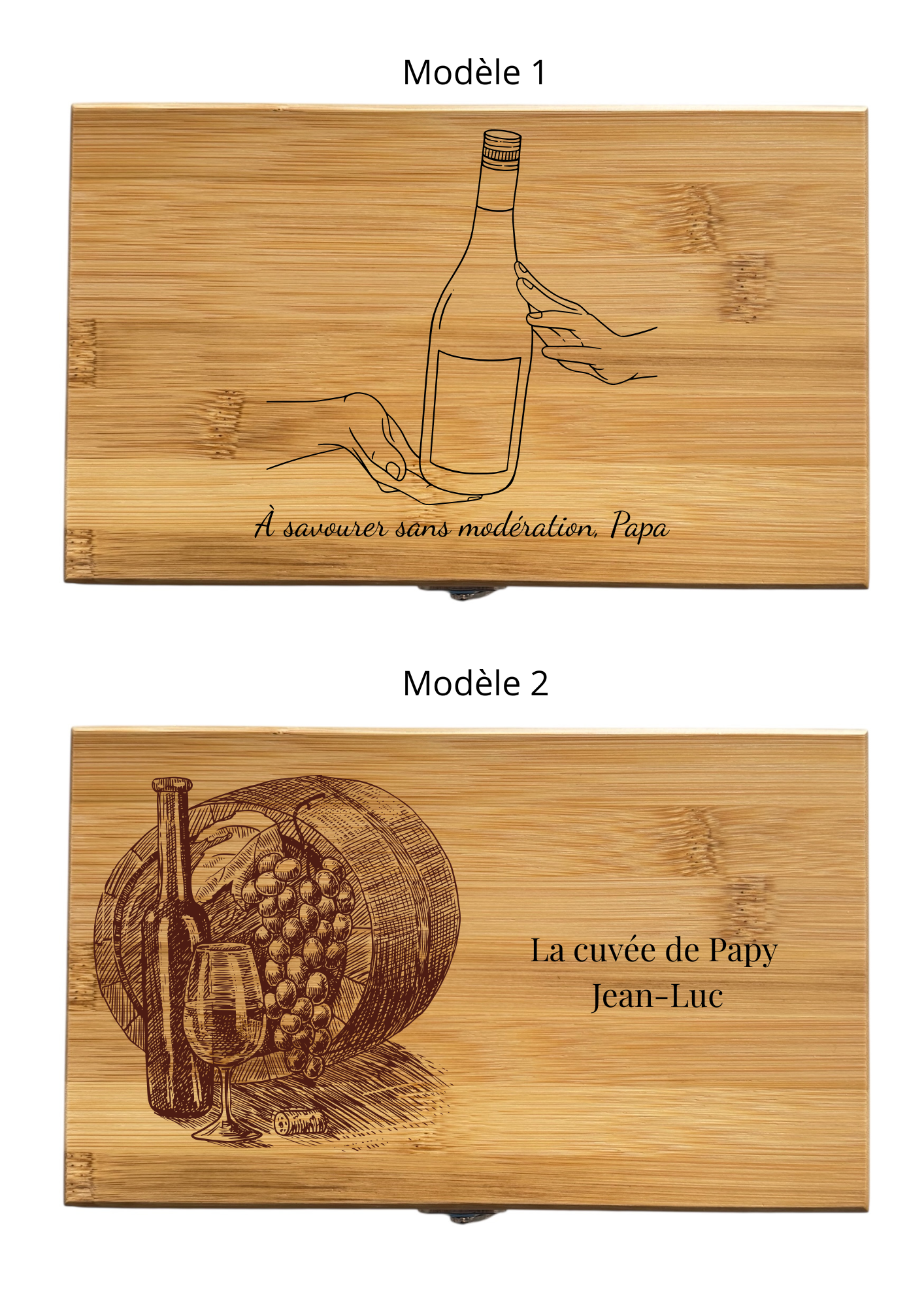 Chaque coffret est gravé au laser dans notre atelier Gravencia, et personnalisé avec le modèle et le prénom ou la phrase de votre choix.