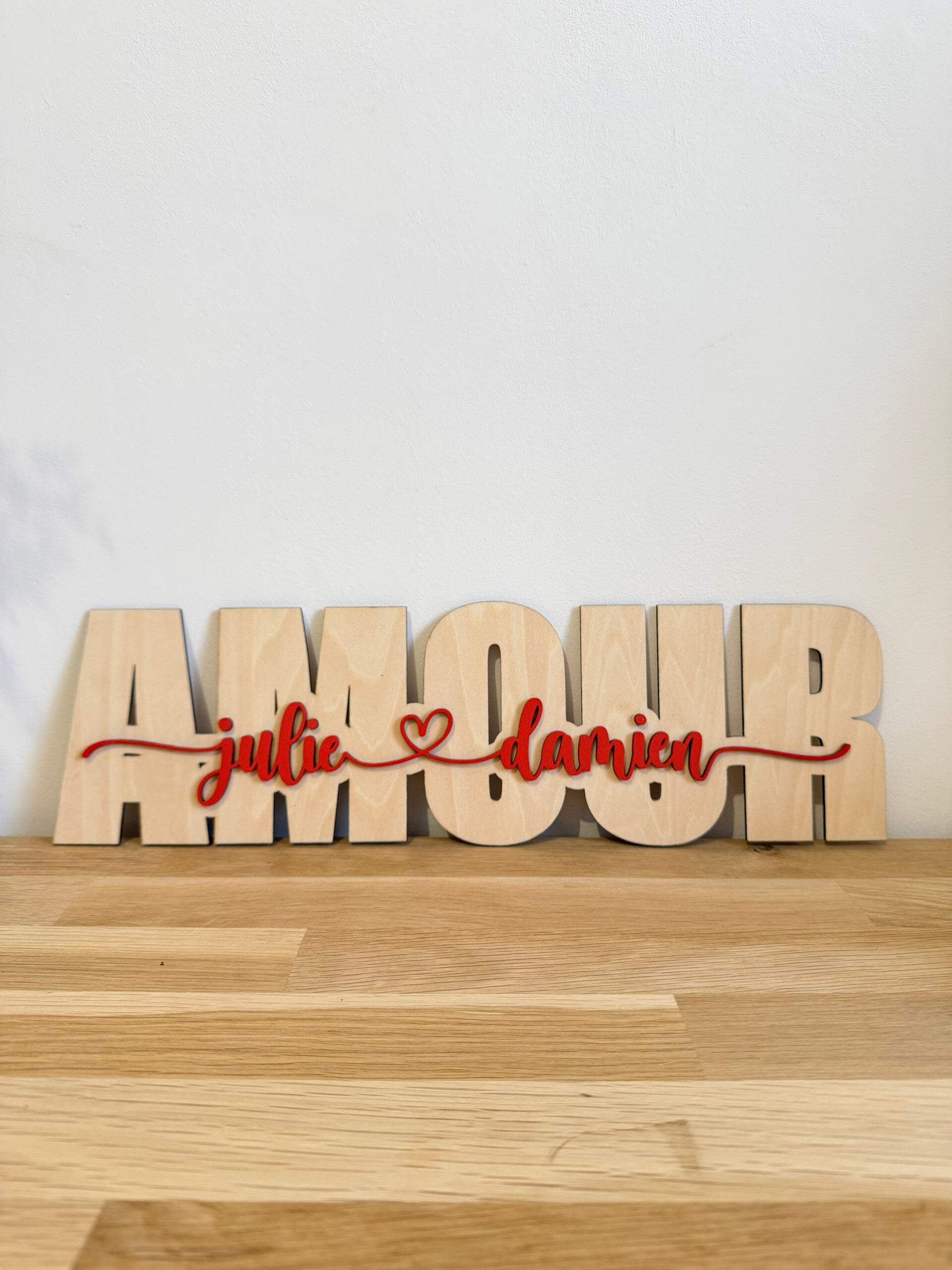 Les prénoms sont découpés et apposés en relief sur le mot AMOUR, reliés par une ligne élégante, pour un rendu à la fois moderne et doux.