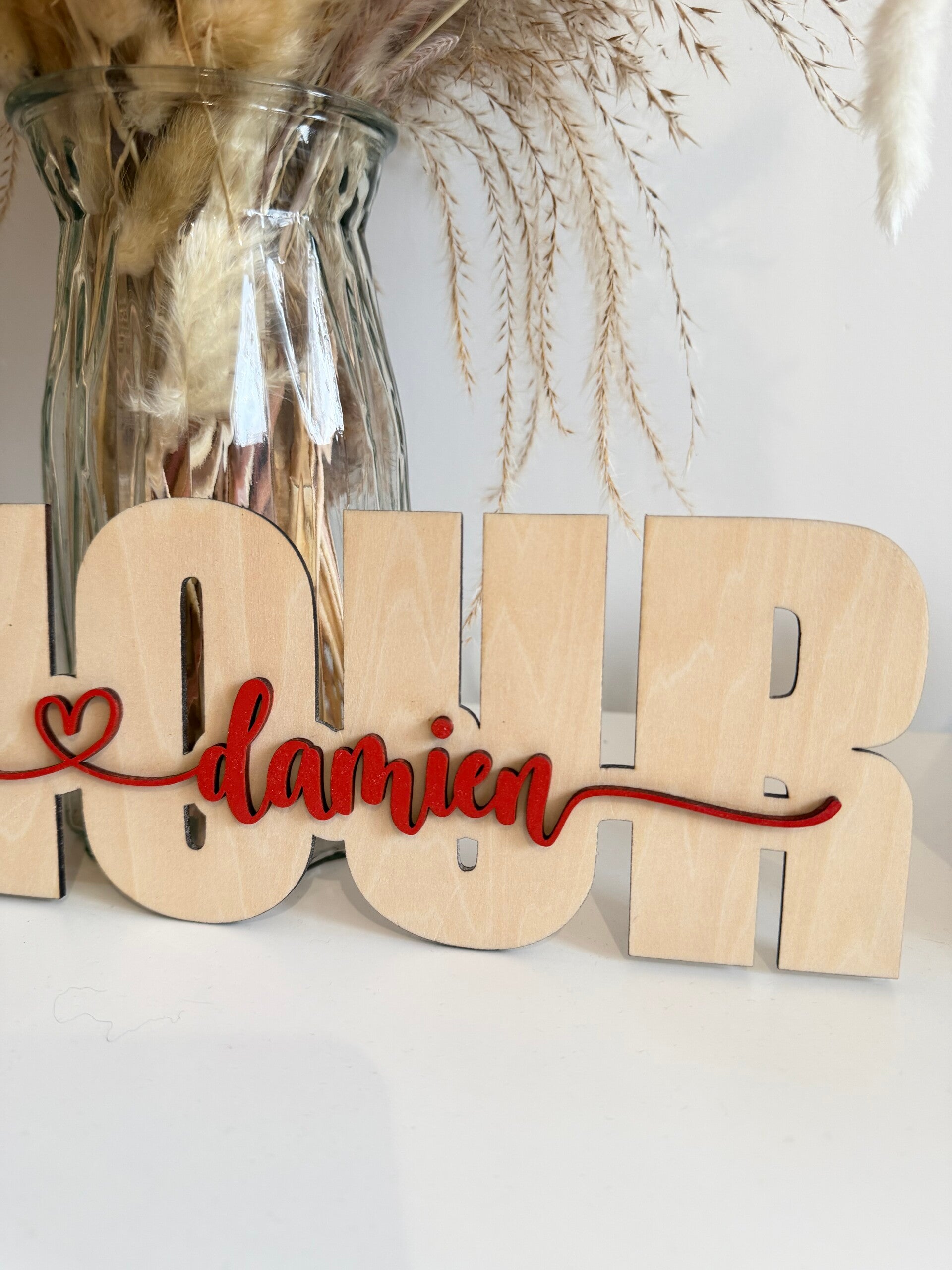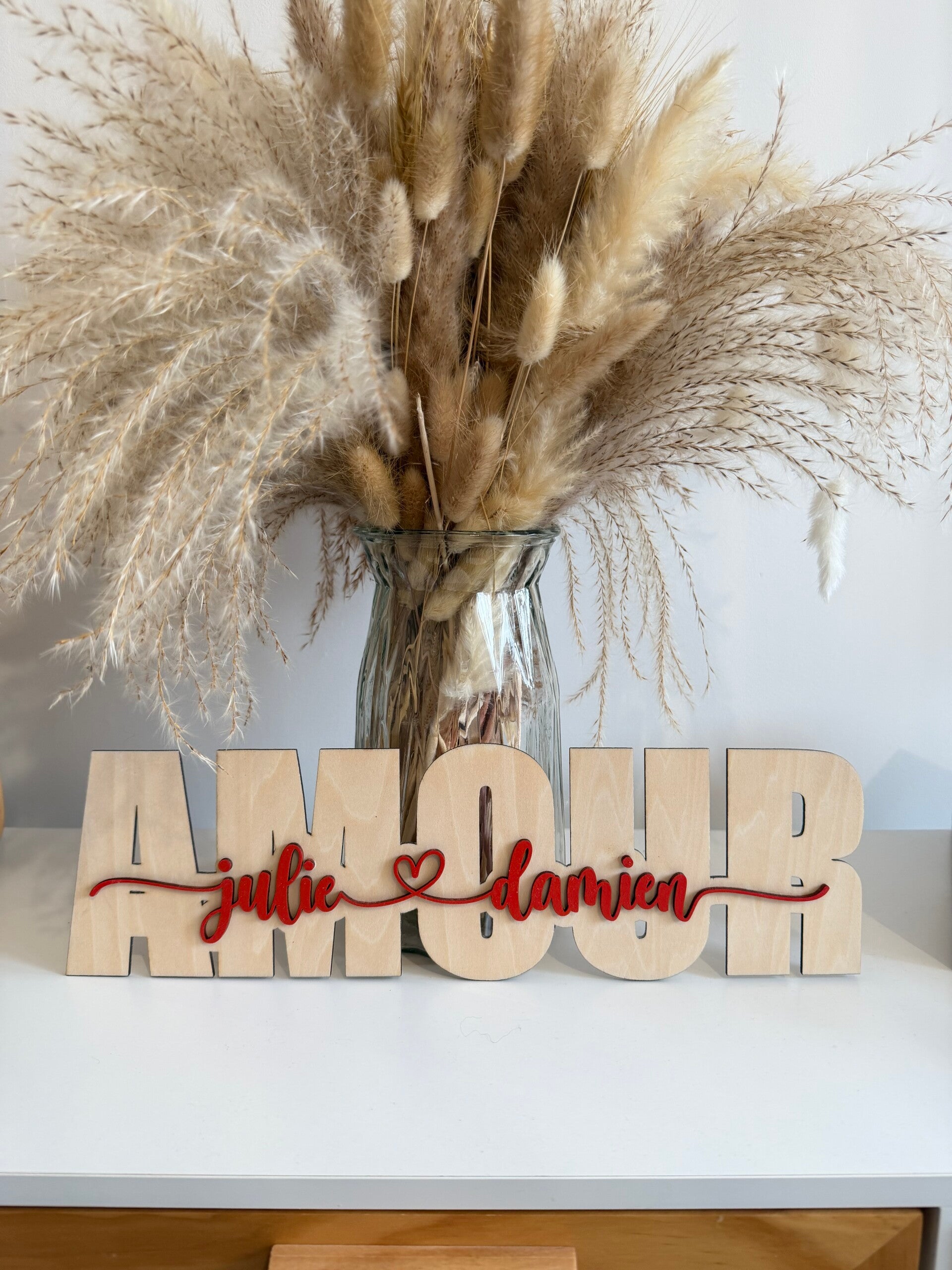 Avec son mot AMOUR découpé dans le bois et les prénoms du couple en relief, cette enseigne devient une véritable pièce décorative, à la fois élégante, chaleureuse et profondément personnelle.