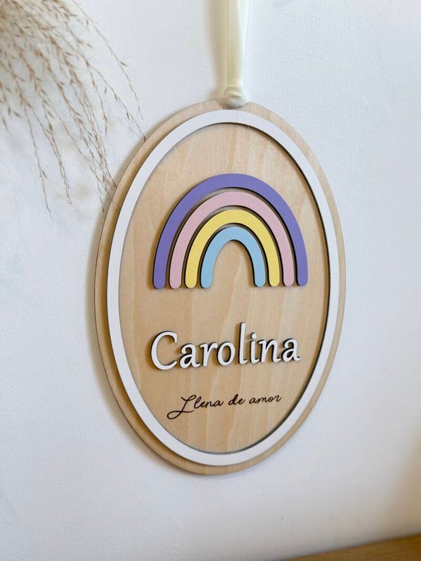 Plaque prénom enfant personnalisée – Arc-en-ciel en bois