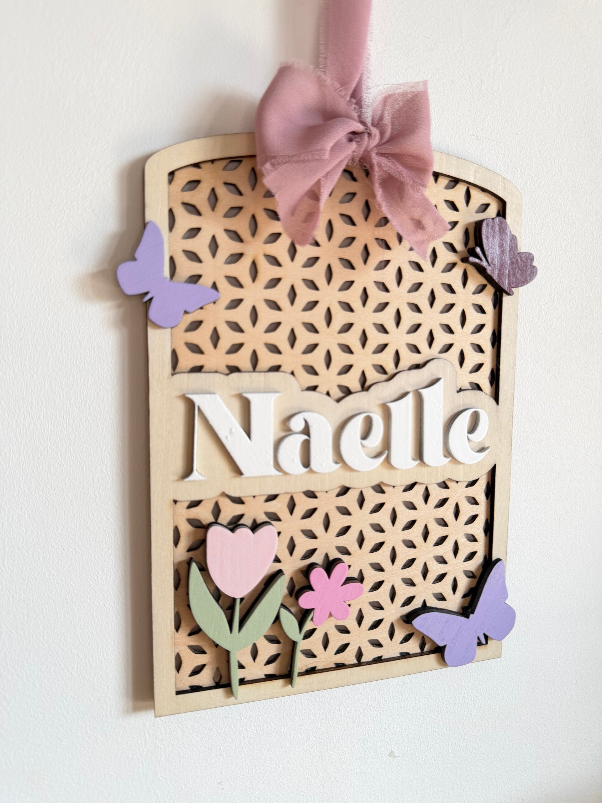 Plaque prénom personnalisée en bois – décoration chambre enfant fleurs et papillons